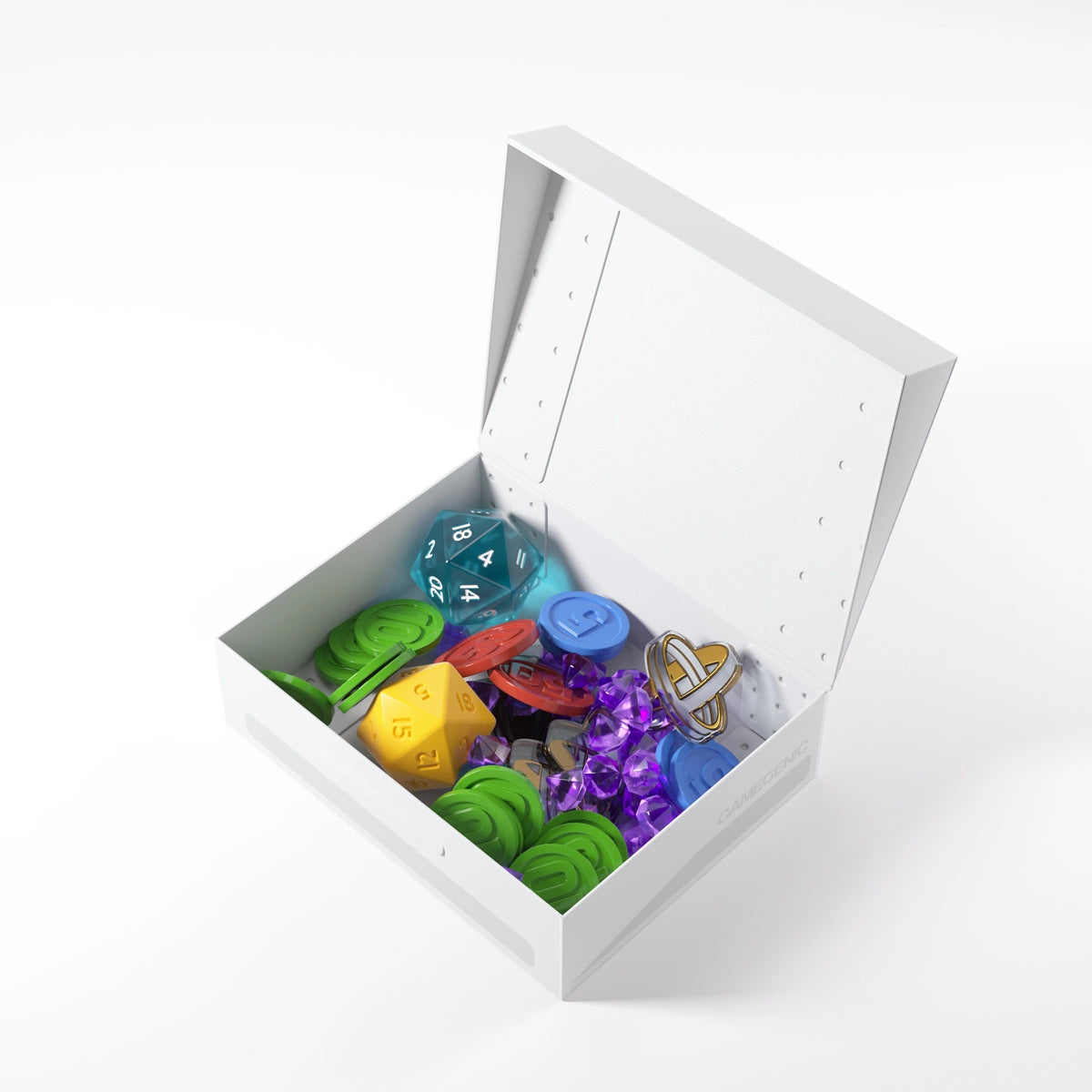 Spar værdifuld plads i spilkassen eller på bordet med vores Token Holder. Denne robuste boks rummer en bred vifte af tokens, terninger og kort – helt op til 40 dobbelt-sleevede eller 80 usleevede kort*.