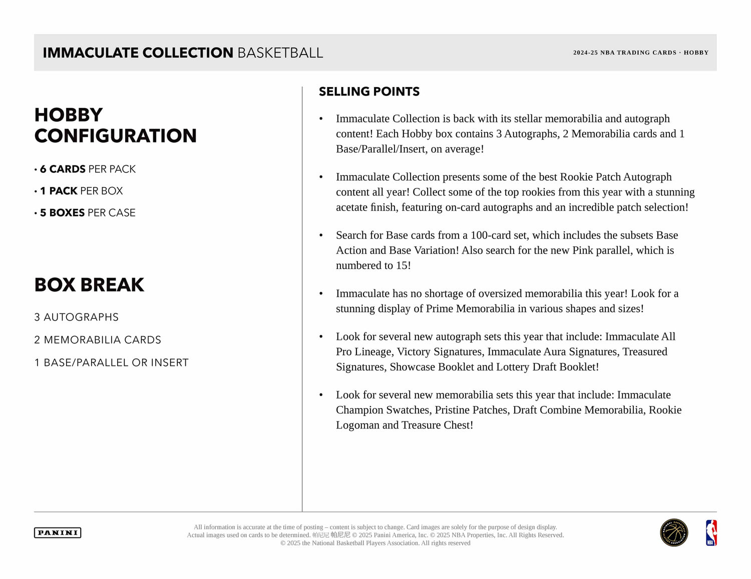 Panini Immaculate Basketball 2024/25 - Hobby Box indeholder i gennemsnit: