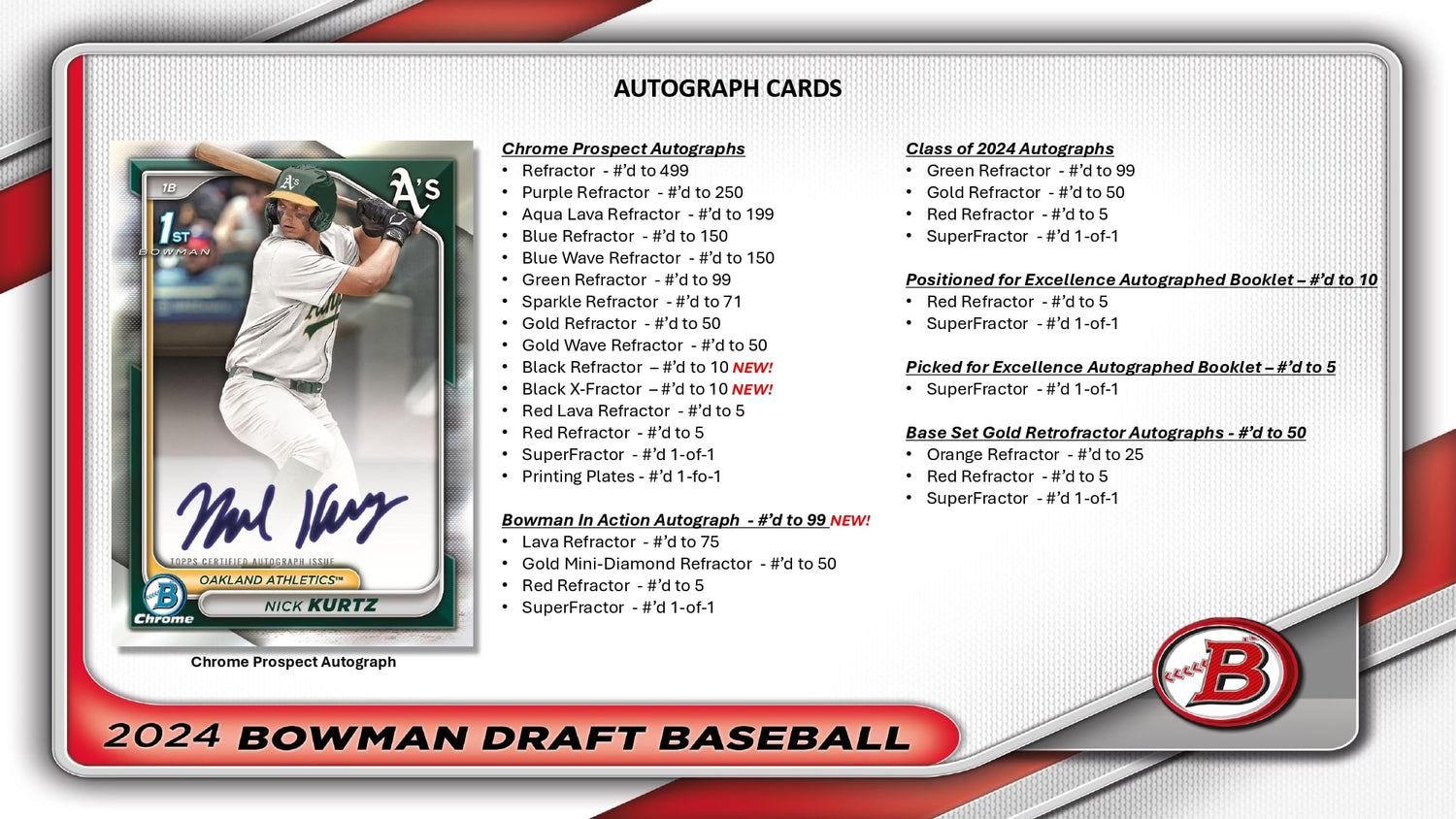 Topps Bowman Draft Baseball 2024 - Jumbo Pack indeholder: 1 autografkort 8 chrome refractors 120 kort i per pakke Se checklisten her.  Læs mere