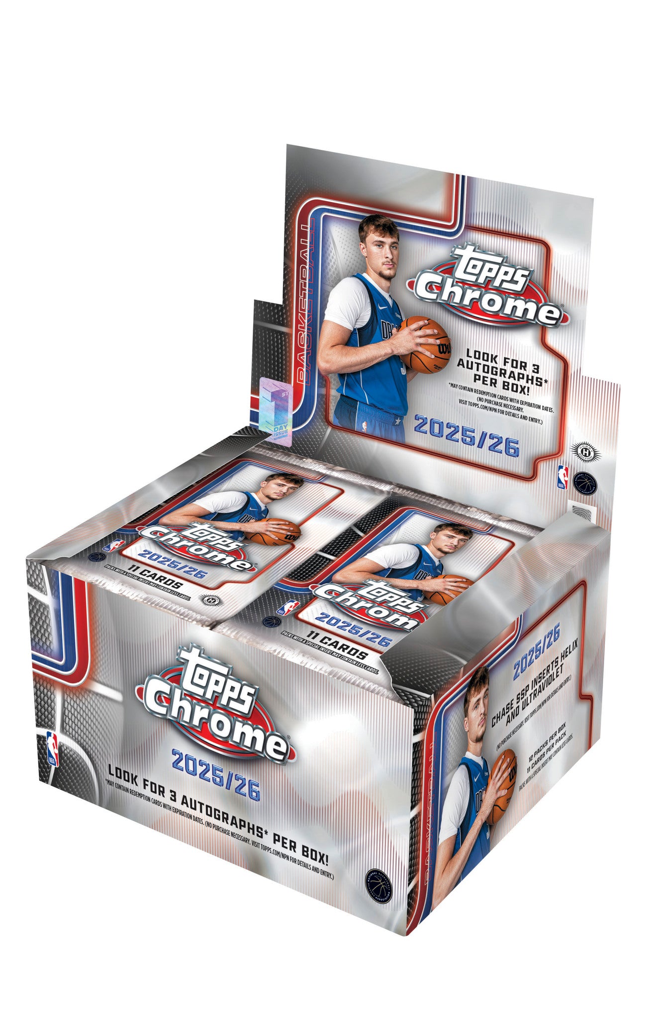 Topps Chrome Basketball 2025/26 - Jumbo Box indeholder: 3 autografkort 5 Base paralleller 6 Prism Refractor paralleller 16 inserts 12 pakker med 11 kort Se checklisten her.  Læs mere